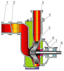 该泵均采用轴向回液的泵体结构。泵体由吸人室、储液室、涡卷室、回液孔、气液分离室等组成,泵正常起动后,叶轮将吸人室所存的液体及吸人管路中的空气一起吸人,并在叶轮内得以完全混合,在离心力的作用下,液体夹带着气体向涡卷室外缘流动,在叶轮的外缘上形成有一定厚度的白色泡沫带及高速旋转液环。气液混合体通过扩散管进人气液分离室。此时,由于流速突然降低,较轻的气体从混合气液中被分离出来,气体通过泵体吐出口继续上升排出。脱气后的液体回到储液室,并由回流孔再次进入叶轮,与叶轮内部从吸人管路中吸人的气体再次混合,在高速旋转叶轮作用下,又流向管道泵叶轮外缘